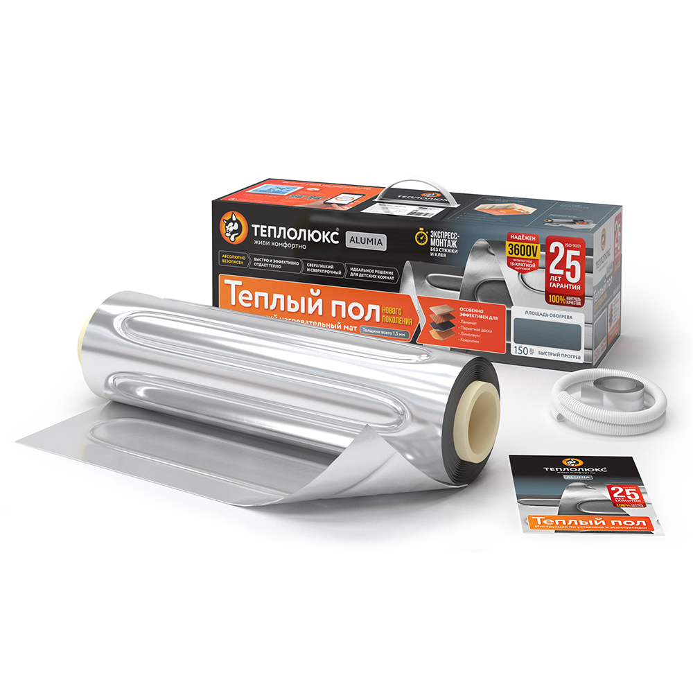 Особенности и преимущества теплых полов Теплолюкс серии Alumia: тонкий теплый пол на основе миниатюрного нагревательного кабеля, уложенного между слоями фольги, сухой монтаж без стяжки, не поднимает уровень пола, все соединения выполнены в заводских условиях с необходимыми этапами контроля, максимально быстрый монтаж – разложи и подключи терморегулятор (без монтажа соединений), готово к использованию сразу после укладки, фольга равномерно распределяет тепло, экранирует электромагнитное излучение, нагревательный мат заземлен и электрически безопасен.