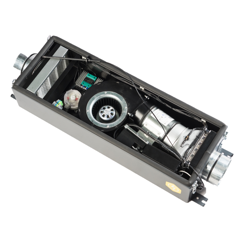 Особенности и преимущества: керамические нагреватели, датчик засоренности фильтров, автоматическая воздушная заслонка, вентилятор с EC-мотором, встроенная автоматика, шумо и виброизолированный корпус, датчик температуры приточного воздуха DBK, фильтр грубой очистки класса G4, фильтр абсолютной очистки класса H11.